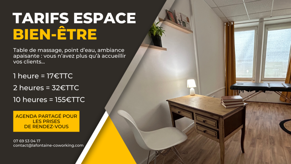 Depuis plusieurs années, La Fontaine Coworking reçoit régulièrement des demandes de praticiens du bien-être qui cherchent un espace professionnel, équipé, chaleureux et flexible, pour accueillir ponctuellement leurs clients : masseurs, réflexologues, sophrologues, ostéopathes, esthéticiennes, praticiens en soins énergétiques etc.